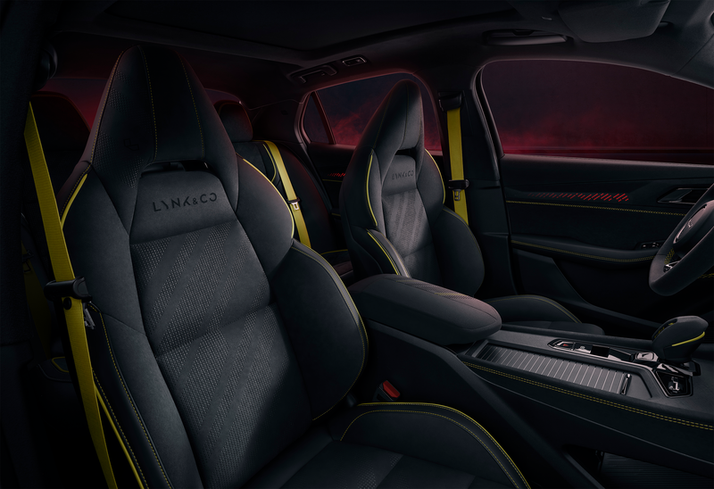 Ghế ngồi của Lynk & Co 03+ có kiểu dáng thể thao, được bọc da và vải Alcatara, với các đường chỉ khâu tương đồng với màu sơn ngoại thất, tạo nên sự hài hòa và phong cách.